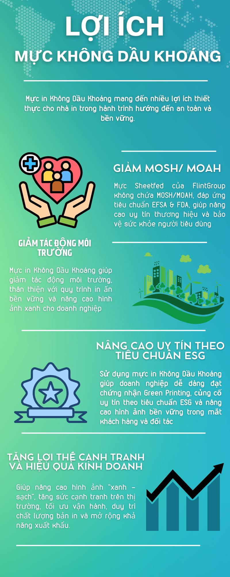 Bên cạnh đó, việc sử dụng mực Không Dầu Khoáng góp phần bảo vệ môi trường, dễ tái chế và thể hiện cam kết phát triển bền vững. Về mặt kinh doanh, áp dụng mực Không Dầu Khoáng giúp nâng cao uy tín thương hiệu, tạo lợi thế cạnh tranh, đồng thời mở rộng khả năng xuất khẩu vào các thị trường khắt khe.